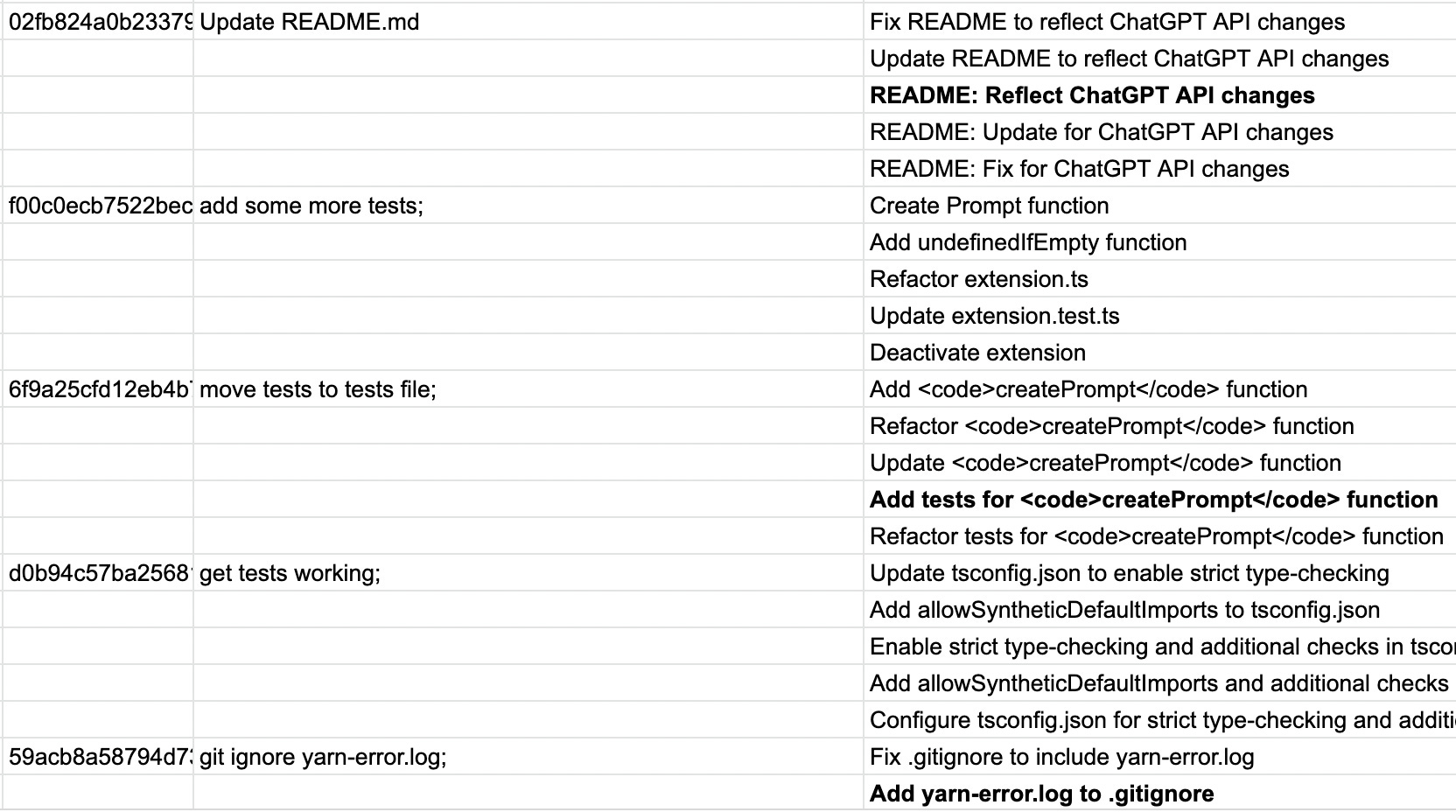 I ran the script over my CodeGPT repo (a beautiful ChatGPT-powered coding assistant in VS Code that’s unfortunately now broken due to ChatGPT cracking down on usage of their unofficial API). The repo has 60ish commits and the run cost about $2 in OpenAI API usage (so, not cheap). Here’s a sample of the results below. You can check out the full results on this Google Sheet.