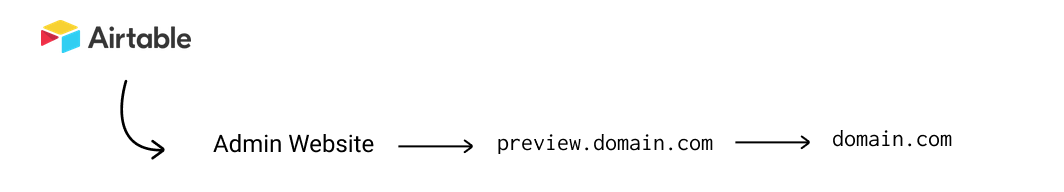 The admin website is bare-bones: two buttons restricted by a password field. The Generate button queries Airtable for the latest content, and produces a Next.js-powered static website served at preview.domain.com. The Promote button promotes the static website from preview.domain.com to domain.com. With the staging website at preview.domain.com, you get to see if your latest updates to Airtable messed something up, and ensure everything looks as it's supposed to before going live on domain.com.