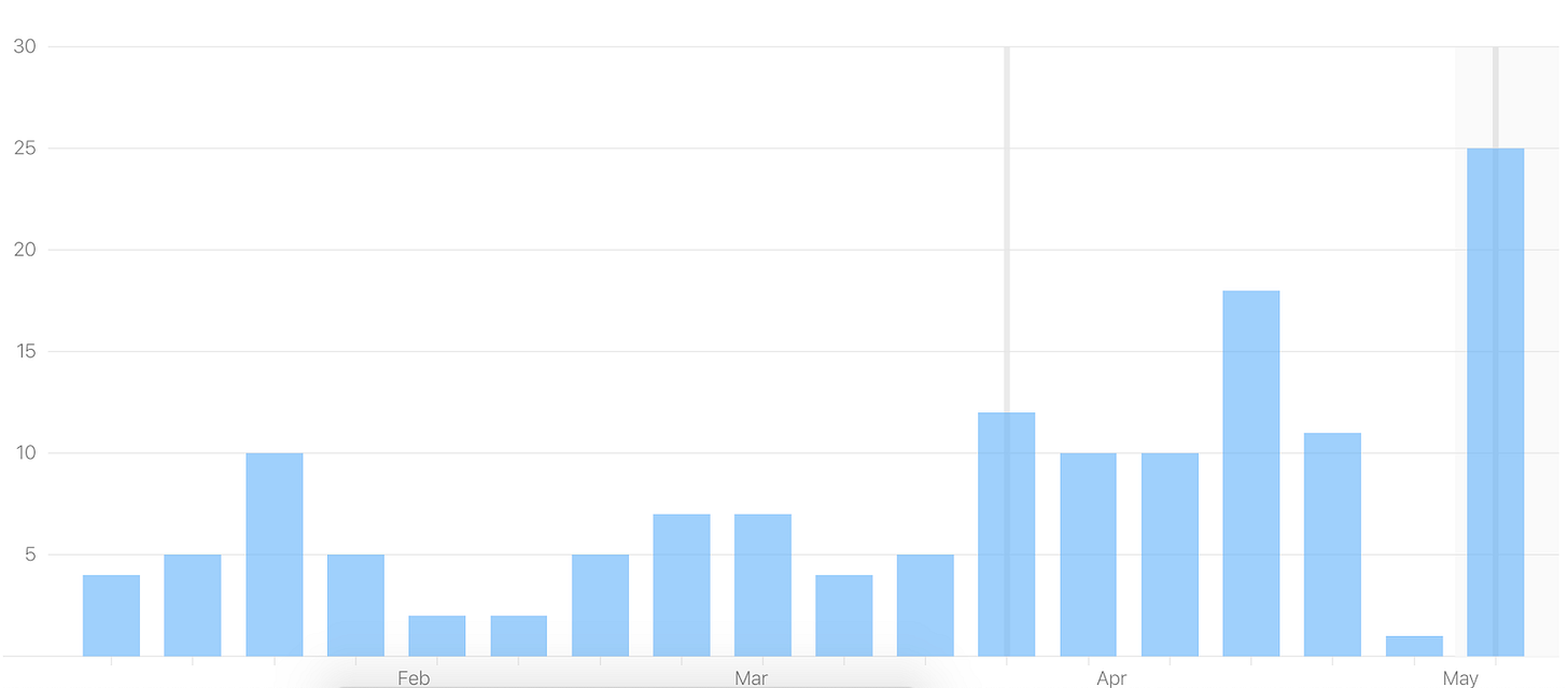 Having been a product manager for the last 1.5 years at a large-ish company helped quite a bit in structuring this time off, the sabbatical, if you will. Whilst previously I would have just waffled from idea to idea as the mood struck, I put in place enough of a structure to keep up the focus and motivation. I’ve been doing 2-week long sprints, with goals, daily updates (“standups”), and a retrospective at the end focusing on learnings and reflection on the goals.