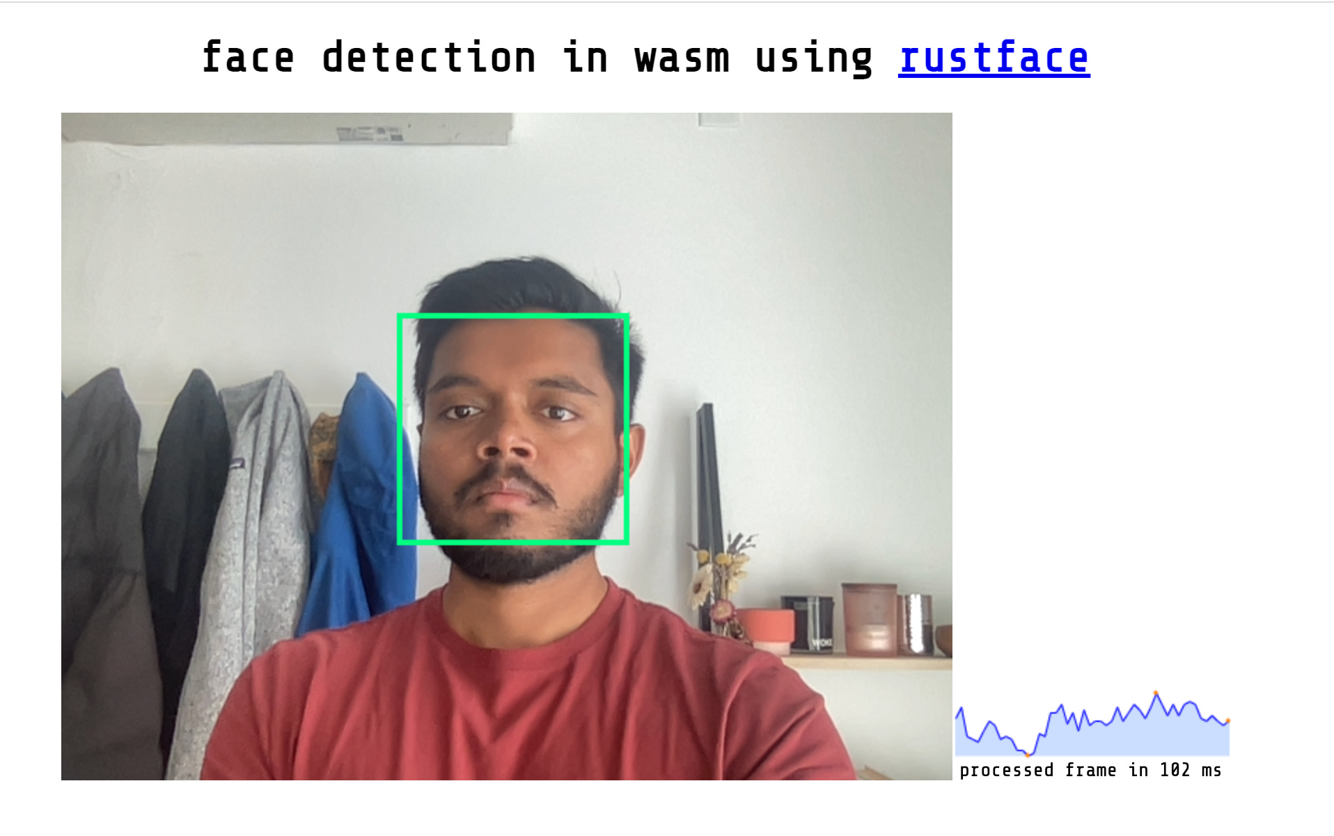 Jumped into a super fun rust/wasm rabbithole for the early part of the week. Got me more excited about building practical AI applications. Built a face detector using a Rust library (rustface) that compiles down to wasm and runs in the browser. Took about 15 hours total, including learning some wasm and Rust. The rust+wasm toolchain is surprisingly well developed and fun to work with.